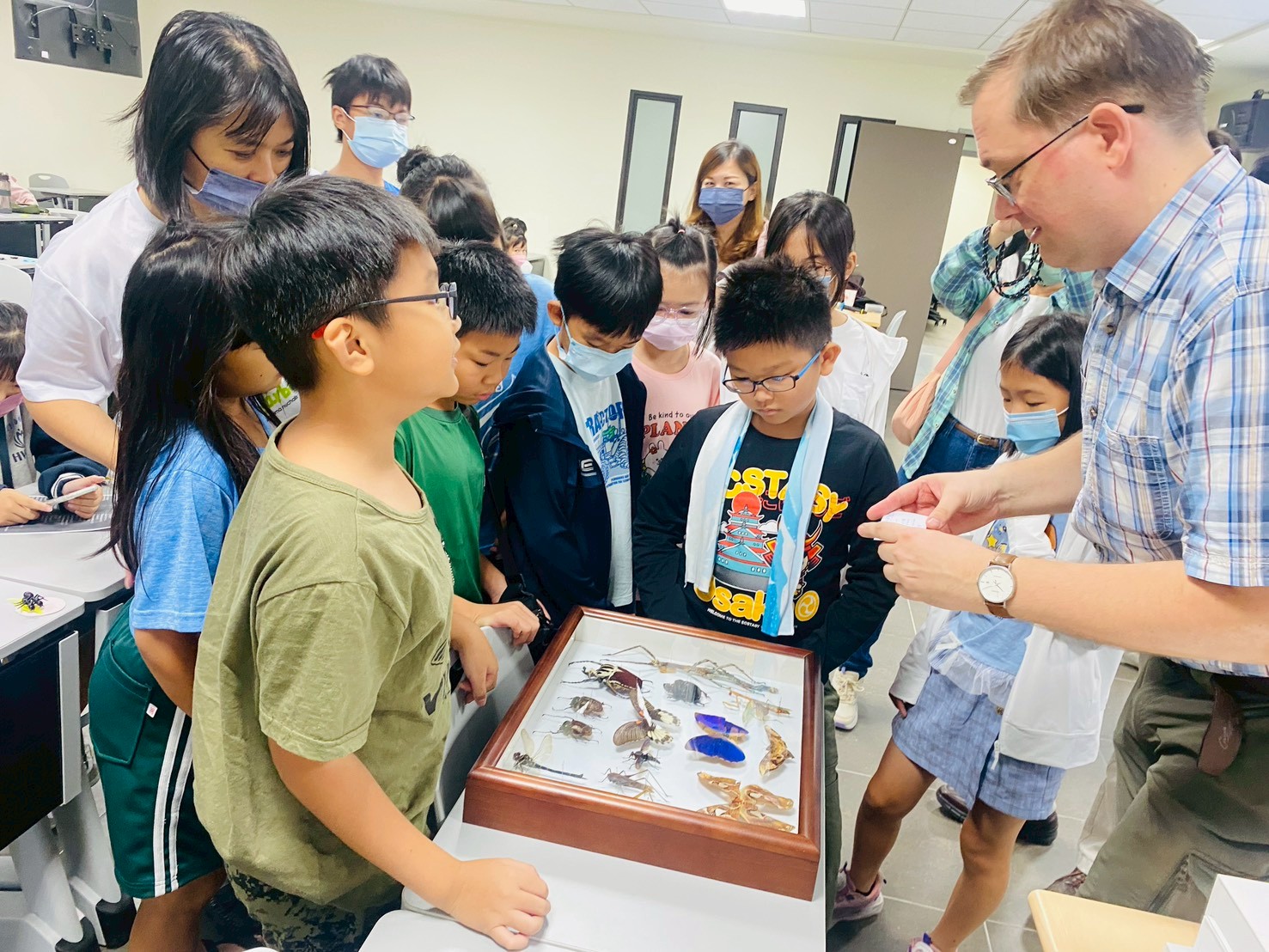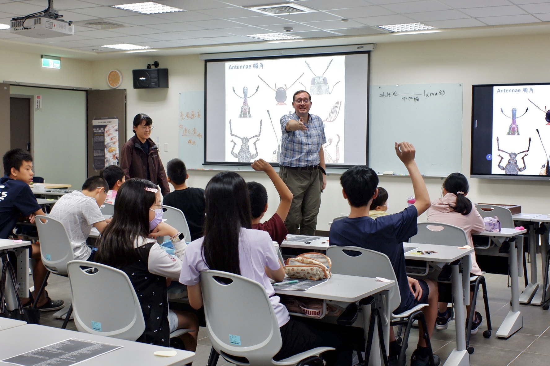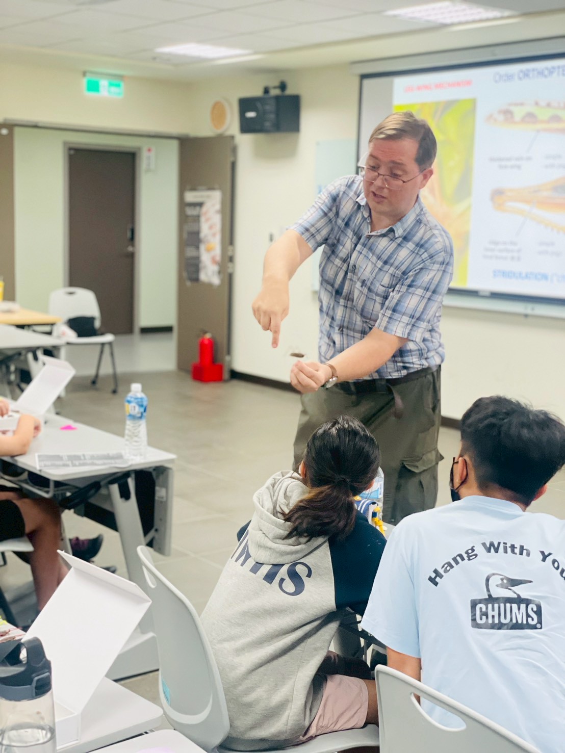 由樂大春 Dávid Rédei老師帶領共56位學員,使用雙語教學介紹關於昆蟲的分類、科目、習性等知識,和學員們討論、互動,引導學員思考與表達,透過標本盒讓學員近距離觀察各式昆蟲的模樣、特色與品種差異,藉由書面結合實物學習對昆蟲知識更有其概念,以及雙語使學員們增加單字、聽力、表達等能力。