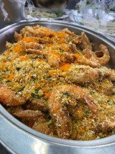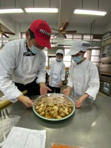 名間國中園遊會的當天,假日餐飲技藝班的孩子們也大展廚神功力,親手準備一場豐盛的午宴,邀請全校教職員工及國小的師長們享用,共有13道主菜與4道甜品,有避風塘炒蝦、麻油松阪豬及鮮菇燉雞湯等經典菜色。成果展示的前幾天,孩子們就開始籌備,從製作點心到餐點前製作業,皆不馬虎,短短一小時的午宴時間,背後其實耗時超過70個小時籌備。