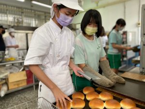 還沒踏入烘焙教室,剛出爐的麵包香氣撲鼻而來,在外頭的我們不禁讚嘆起孩子們的手藝,在國中這個年紀就能獨立完成烘焙成品,也無懼烤箱高溫,實在難得!一打開門,孩子們埋頭操作的認真畫面即映入我們眼簾,因今日的課程是模擬丙級術科實作,每個人都必須在時間內完成考試成品,所以大家都聚精會神的準備著,深怕一個步驟或動作不確實,會影響到成品或是完成時間,在旁的我們都可以感受到那緊張的氣息。