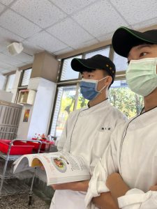 今天的菜單分別是時蔬燴蝦丸、蔥串排骨、韭黃蛋皮捲等7項料理,同學們穿戴著專業的廚師服,聚精會神排排站著仔細聆聽及觀察老師的每一個步驟,筆記本更是滿滿記錄著小細節,站在兩排的我們隨之緊張起來,深怕驚擾他們。