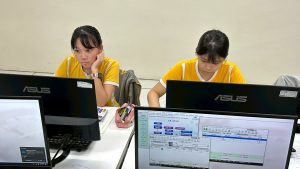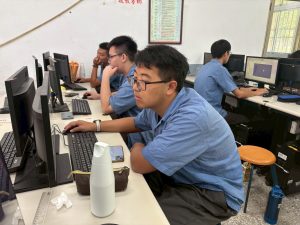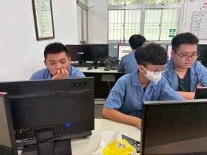 接著驅車前往路程約 30 分的北港農工,今年已是第三年辦理。抵達時已近中午時分,有些同學已經進入機台操作,有些仍在專注撰寫程式。聽聞有同學從嘉義太保搭車到校,長途奔波卻依舊不缺席,我們深受感動。問他是否辛苦,他堅定地回答:「克服這種小事,能換來日後的專業技術,再累也值得。」另一位同學更是信心滿滿地喊出:「我一定要通過乙級!」