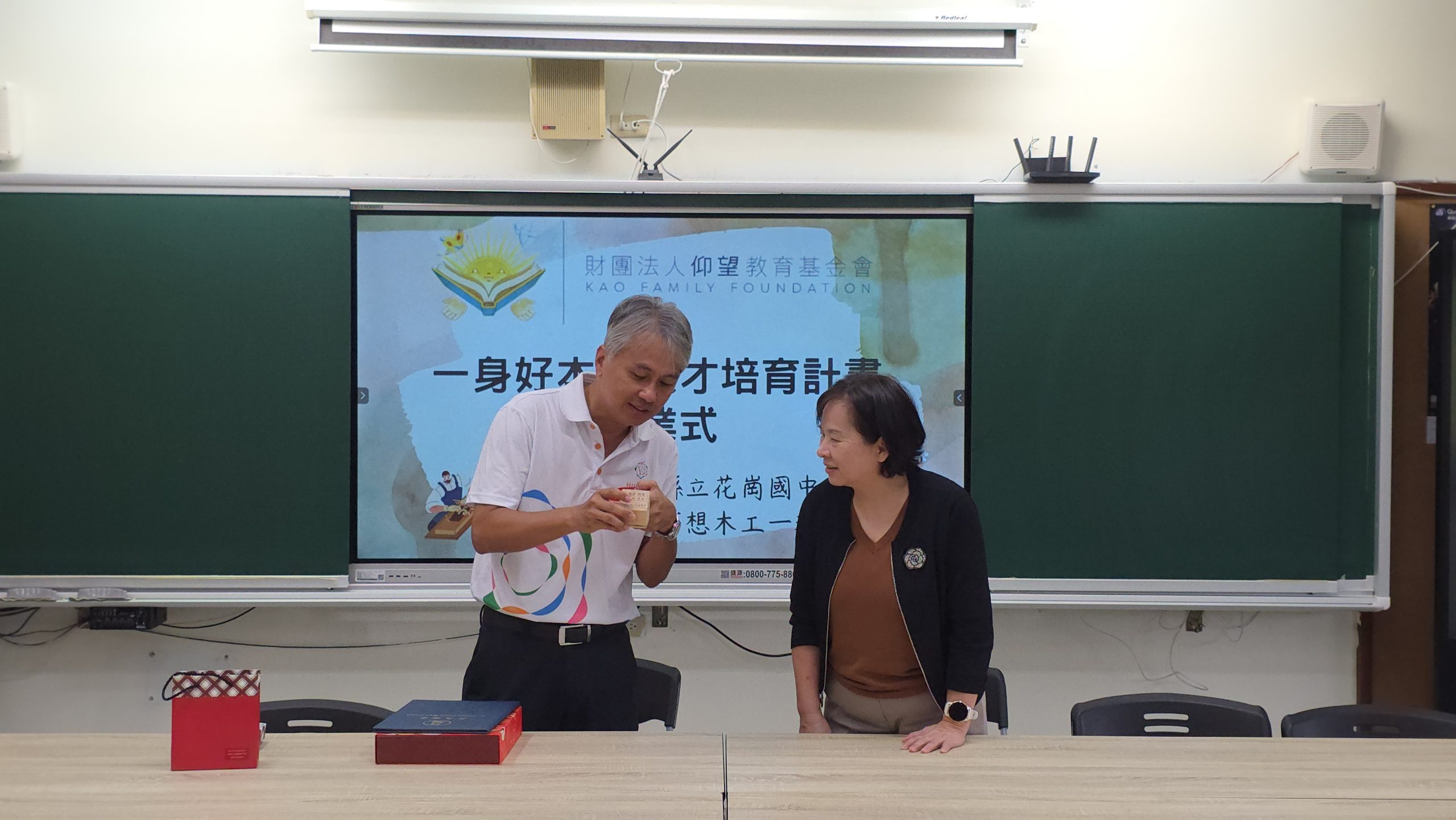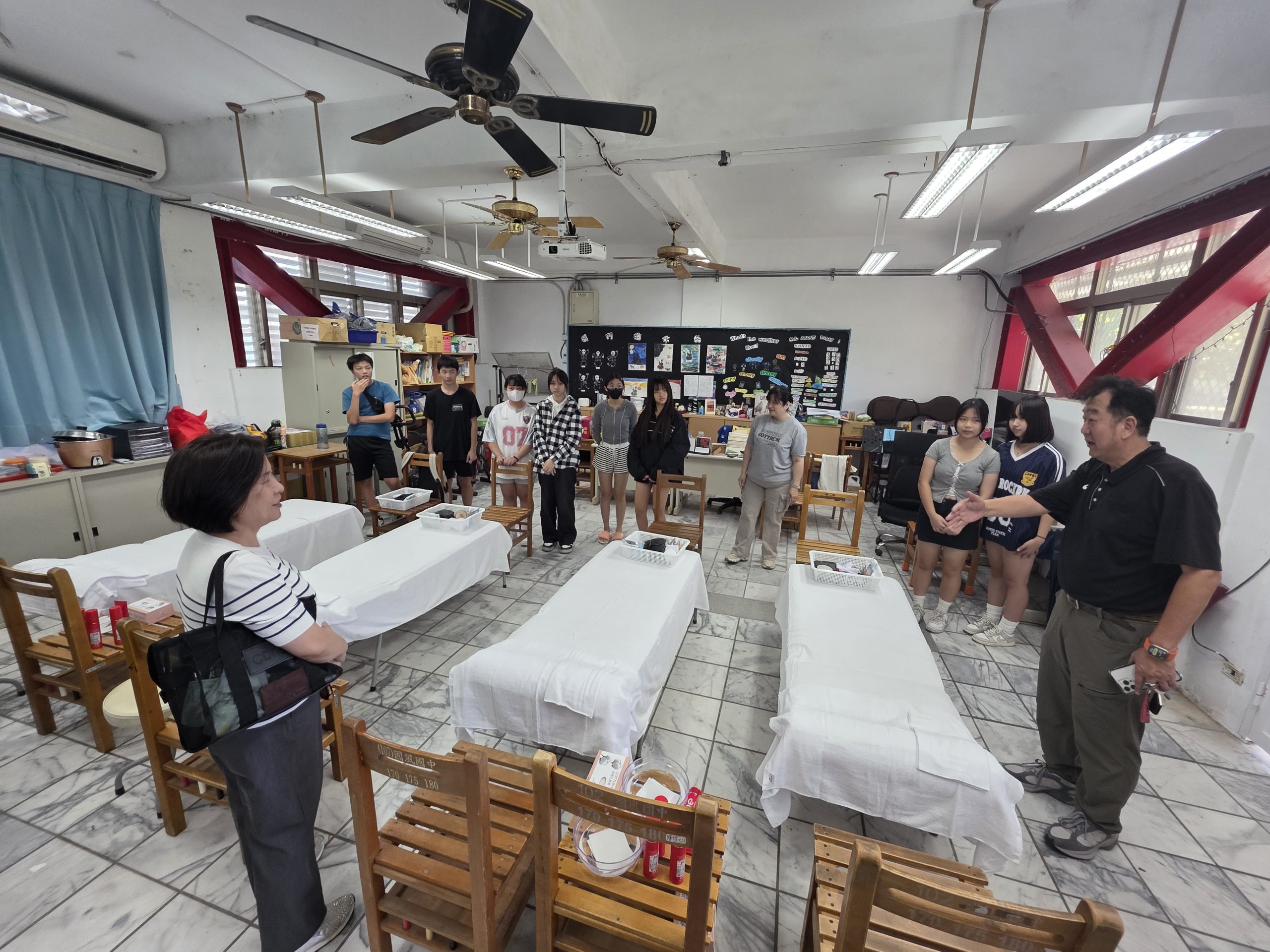 週日返程前,我們來到此次訪視行程的最後一所學校——花崗國中。學校開設的課程是「木工班」。校長與主任滿懷熱情地向我們介紹授課老師林建耀老師,他原本就是學校的多元課程教師,長期在校內教授木工相關課程。這次因應基金會的邀請參與「一身好本領」計畫,學校便決定開設木工班,讓更多學生有機會動手實作、培養技藝。