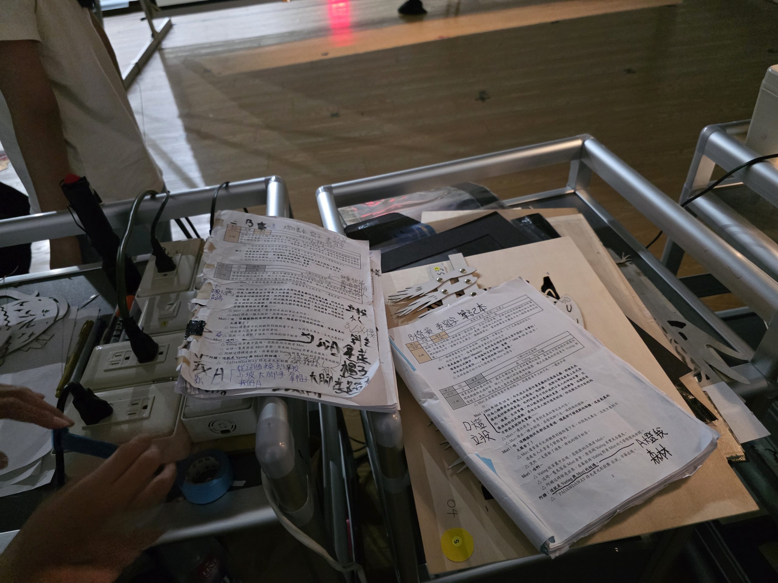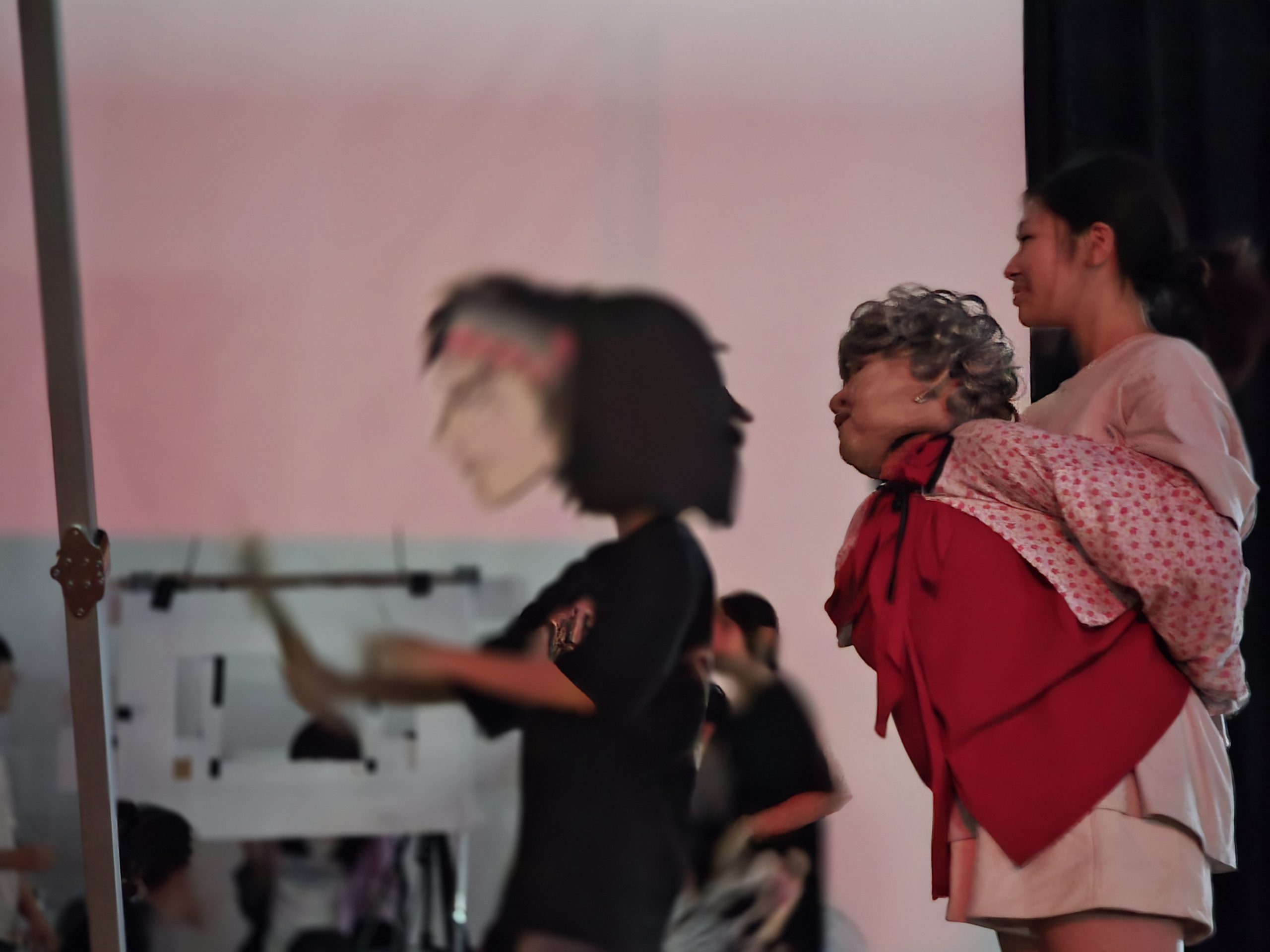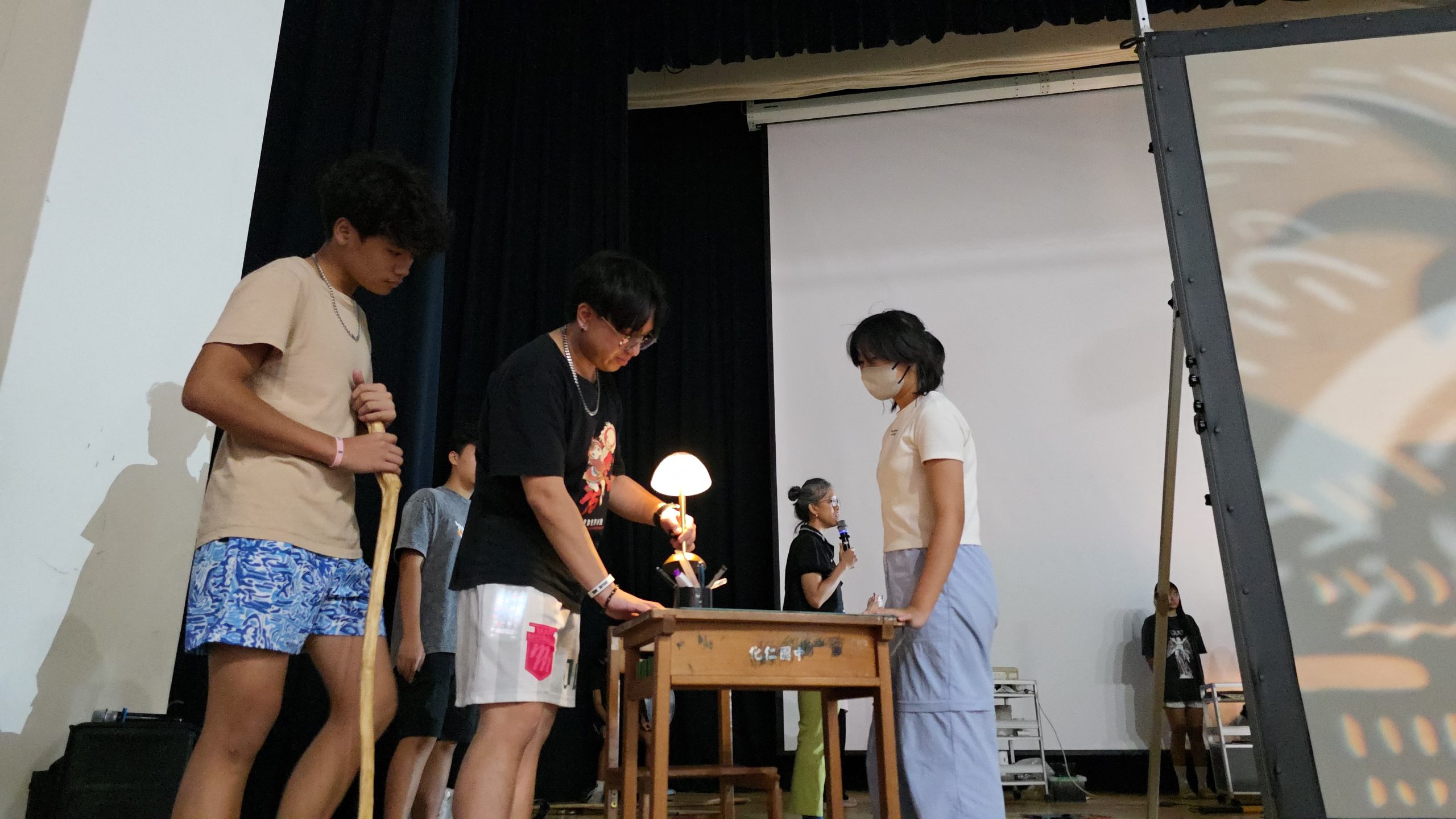 走進幕後,我們看見每位學生分工合作,專注地聽從老師指令,運用道具配合說書人的旁白,引導劇情推進。當天他們正進行《光來自山的背面——奇萊平原三部曲》的彩排,作品以阿美族的「三股編」為象徵,串連起奇萊平原的歷史創傷與神話記憶,包括「1878年達固湖灣事件」、「七腳川事件」以及「巨人阿里嘎蓋」的傳說(源自荷蘭東印度公司在東部淘金的歷史)。整齣劇透過當代原住民族青少年的視角回望過去,重新編織族群的記憶,尋找祖靈的聲音。