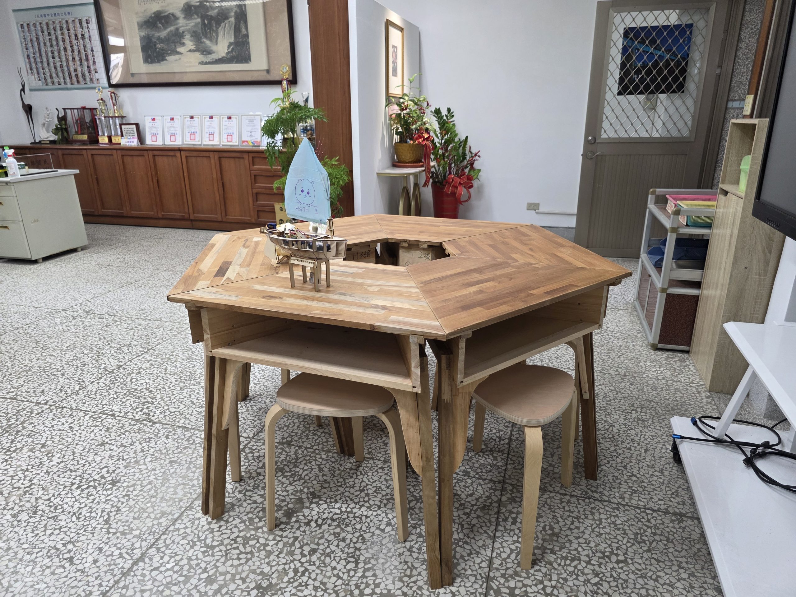 校長特別向我們介紹學校辦公室裡的一張六角木桌,這正是孩子們在林老師指導下,親手切割、打磨、組裝完成的作品。桌子前面貼上每位參與學生的名字,象徵著他們的努力與成果。校長笑著說,孩子們看到自己的作品被擺放在校園中,總是興奮又驕傲,這份被肯定的感覺,也讓他們更願意投入學習。師長們希望未來能在校內更多角落展示學生的木工作品,不僅作為裝置藝術,更成為他們成長與學習的見證。