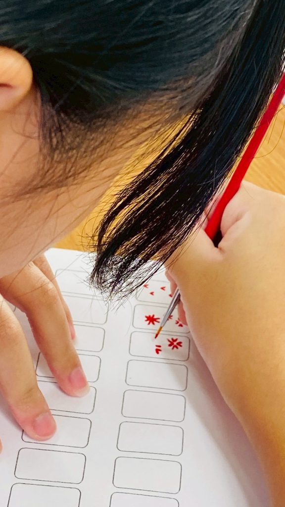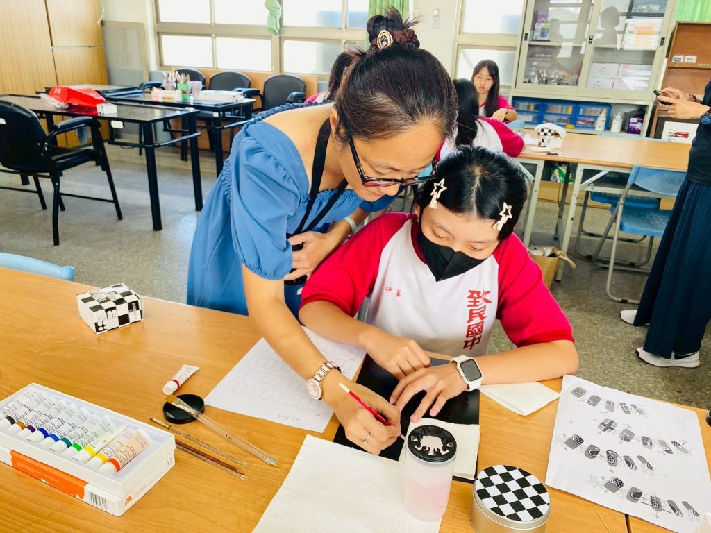 課堂上,學生們聚精會神地完成指甲彩繪紙圖練習,愛心與圓點在紙上綻放成一幅幅獨特的創作,從色彩搭配、筆觸練習到圖樣設計,每一筆都展現了專注與創意,也展現出專屬於他們的美感與個性。