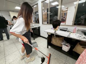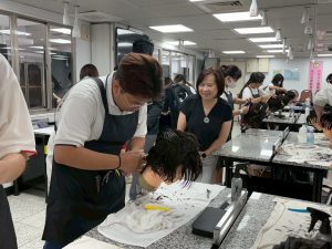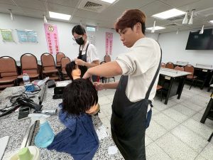 班上有同學遠從屏東搭車前來加強訓練,從未因距離而缺席。那份對學習的熱忱與堅持,正是技職教育最動人的力量。課堂間,學生們除了專注於技術的磨練,也重視整潔與合作。有同學主動拿起掃把整理教室,有人擔任小老師協助同儕。這樣的互動讓學習現場充滿了秩序與溫度。美,不只存在於髮梳與剪刀之間,更存在於他們認真的神情與彼此扶持的心意中。