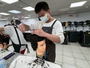 隨後展開實際操作,此次申請的為男子理髮乙級課程。只見剪刀在燈光下閃耀,髮梳與推剪的節奏流暢而穩定。老師逐一巡視指導,強調修剪層次的銜接與頭型線條的平衡。學生們的專注與用心,讓整個教室瀰漫著專業訓練的氛圍。班上四位男同學的表現尤其亮眼,他們在修整、修邊與造型掌控上的精準度,絲毫不遜於女同學的細膩手法。其中一位男同學的家庭從事美髮行業,自小耳濡目染,進入美容科後更確立了追求專業的志向。當他神情專注地剪下每一撮髮絲時,那份沉穩與自信,彷彿預告著未來的職人之路。
