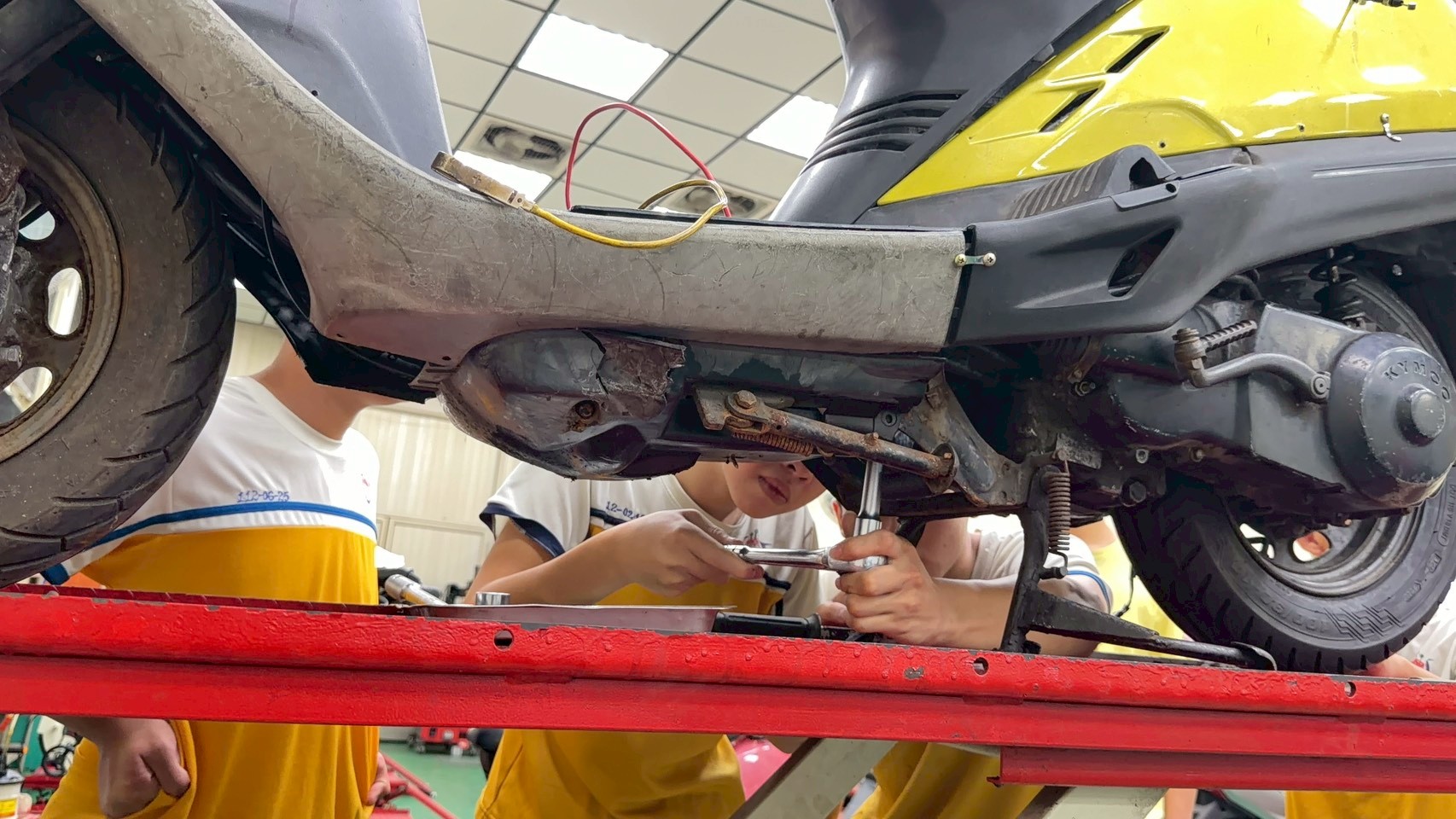今天,是他們開課後的第三次課程。走進教室,只見孩子們依照分組區域各司其職,有的拆解機車引擎,有的練習更換輪胎。儘管僅上過幾次課,但他們已能熟練操作工具,動作俐落,對於機構結構與步驟掌握得相當到位。指導老師在一旁觀察,時而點頭微笑,時而俯身指導,現場瀰漫著專注而充滿熱情的學習氛圍。