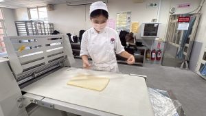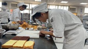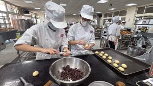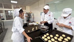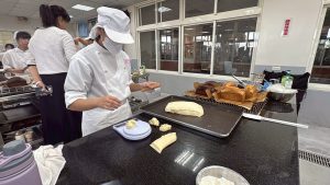 明台高中已連續六年申請烘焙乙級課程,每次到訪都能看見同一位溫暖又專業的指導老師。學生們親切地喊他「師傅」,課堂氣氛總是輕鬆而紮實。今天同學們兩兩一組,在時間壓力下來回奔忙:揉麵、整形、包餡、攪拌奶油、盯著烤箱,一切井然有序。課後,他們更將製作完成的麵包分送給附近的食物銀行,把學習化成善意,令人動容。