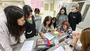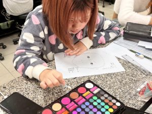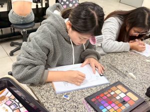老師先向學生們說明乙級檢定的要求,並講解臉部比例與彩妝分布的基礎觀念。學生們一邊聽、一邊在紙上勾勒輪廓,有的輕輕畫出眉型,有的在思考眼影的暈染層次,教室裡安靜得只剩下鉛筆在紙上滑動的聲音。偶爾也能聽到學生彼此討論色彩搭配,或向同學展示自己的草稿,帶著青春特有的活力與創意。