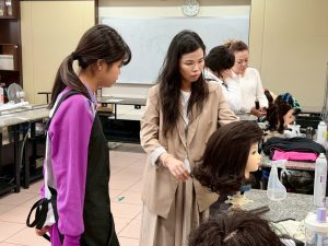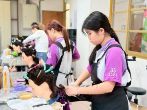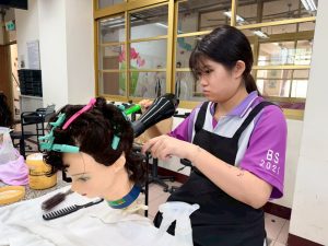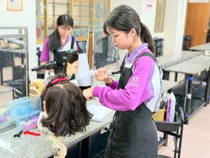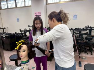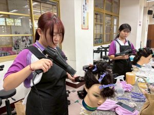 女子美髮乙級課程中,老師提醒同學需特別注意剪髮比例、染髮均勻度、電棒使用安全及操作流程時間控制,相信在這些細節的磨練下,孩子們能更靠近未來的美髮之路。