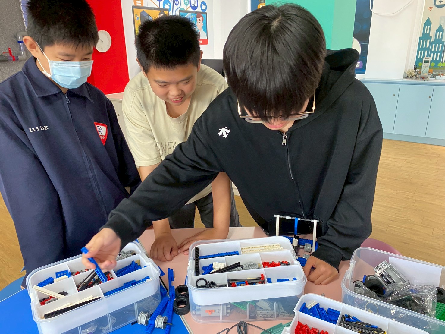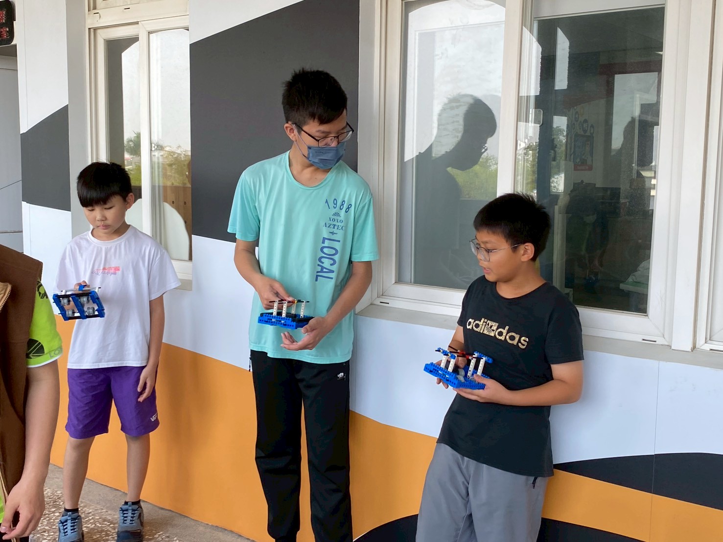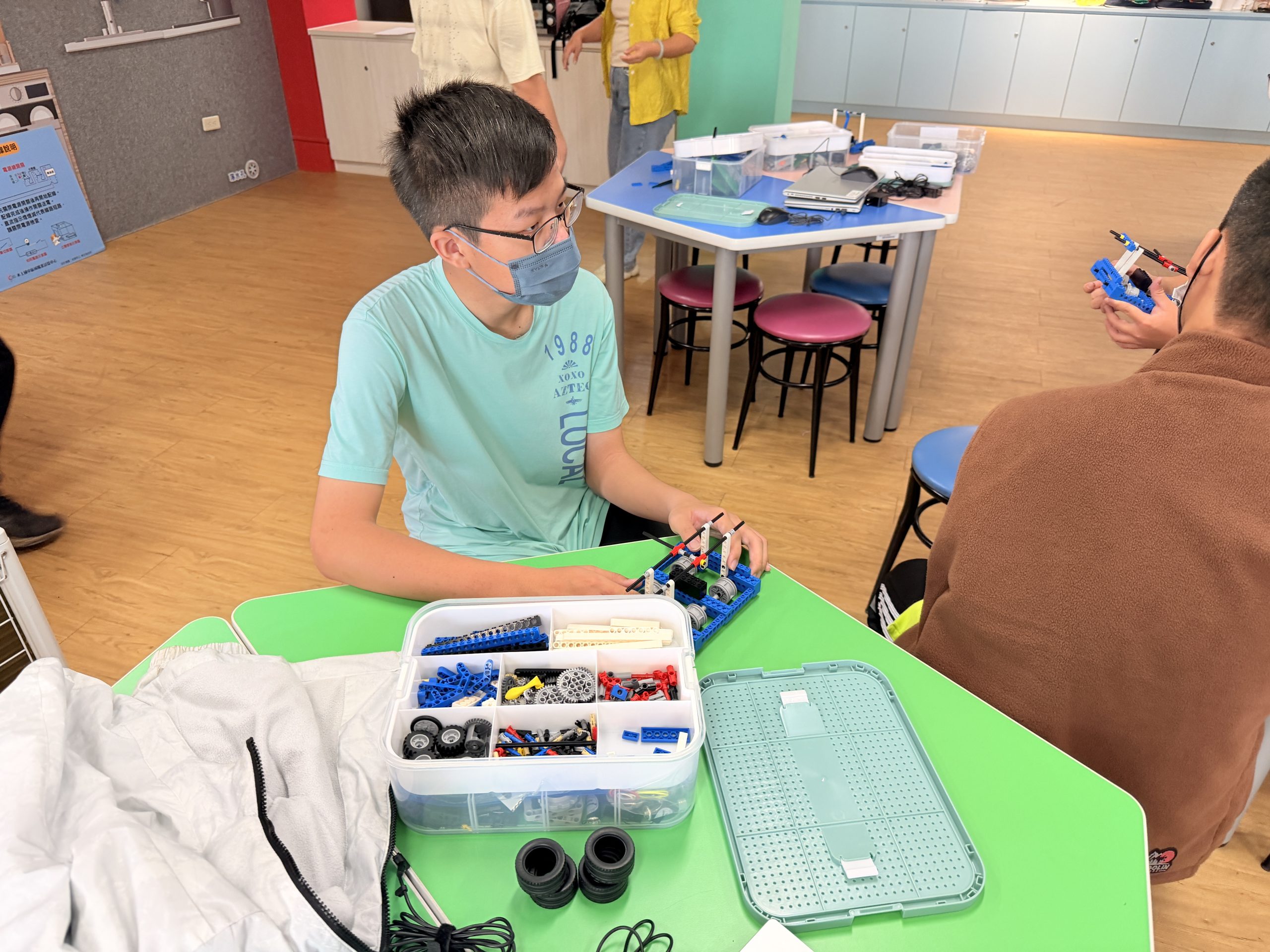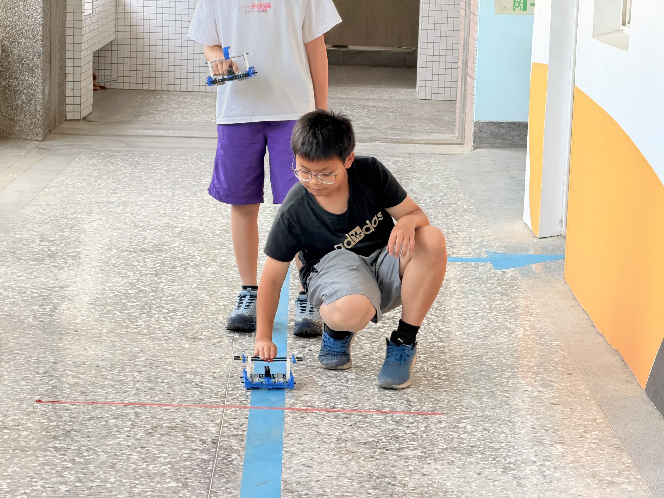 學生們圍著樂高積木,快速組裝出一台台車輛,準備進行滑行競賽。測試、討論、再調整,有的組別開始幫車子「加重」,有的則嘗試改變結構,只為了讓車子更精準地滑到中心點。過程中不時傳來歡呼與懊惱聲,老師再加碼小獎品,現場氣氛瞬間被點燃。