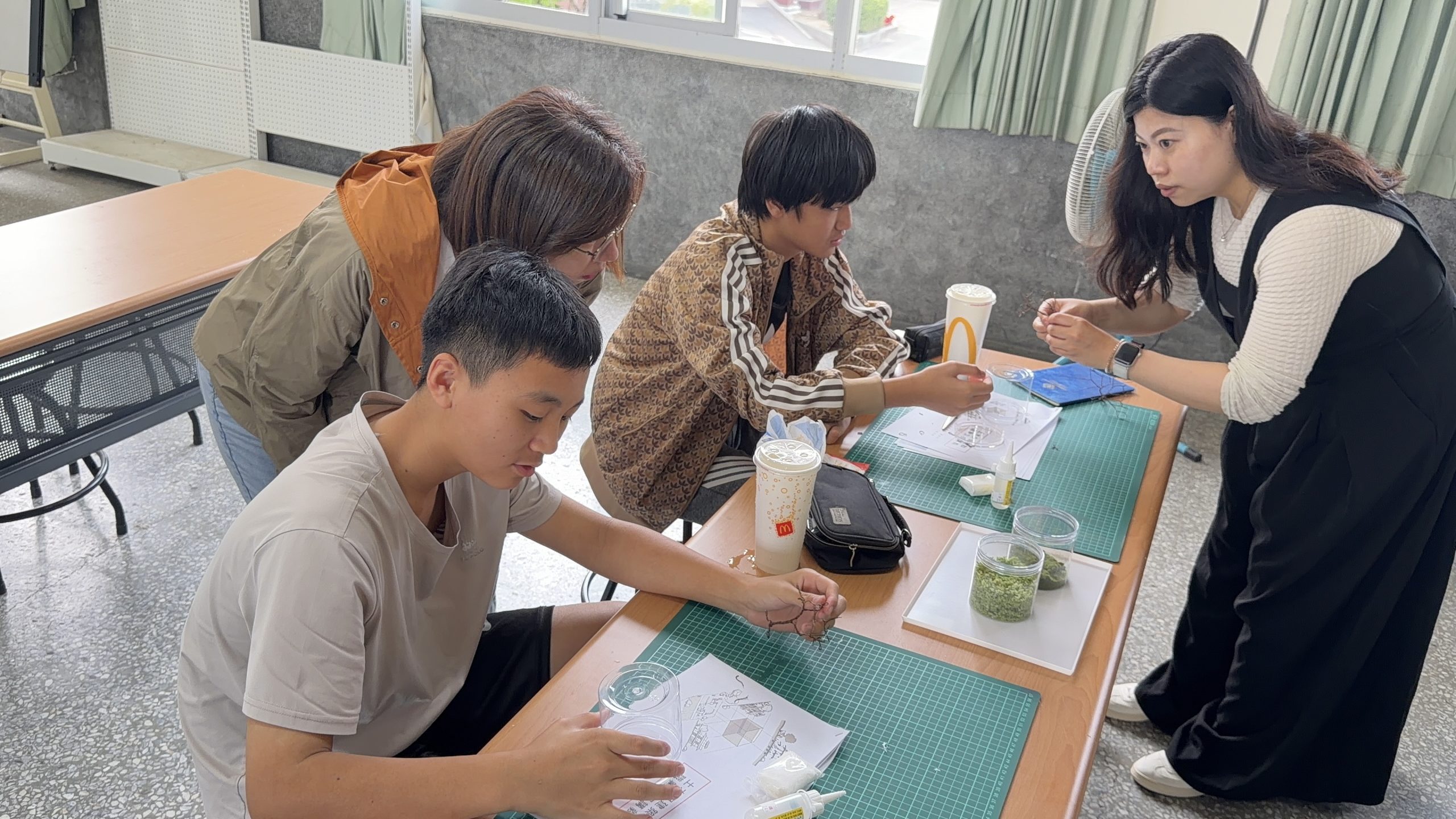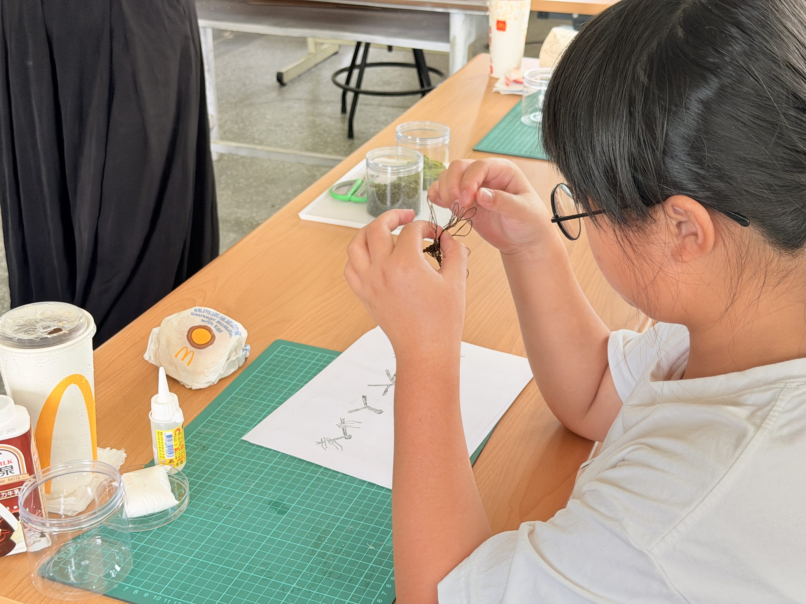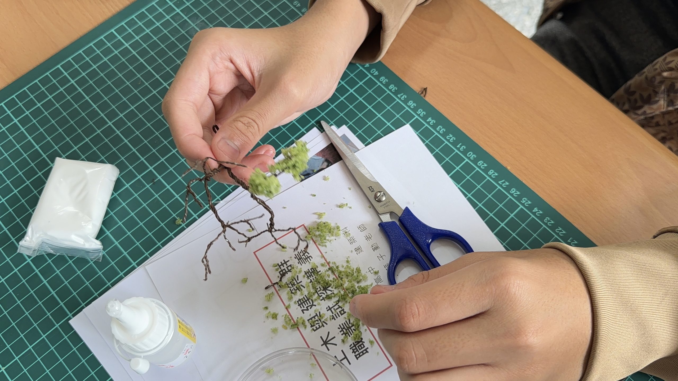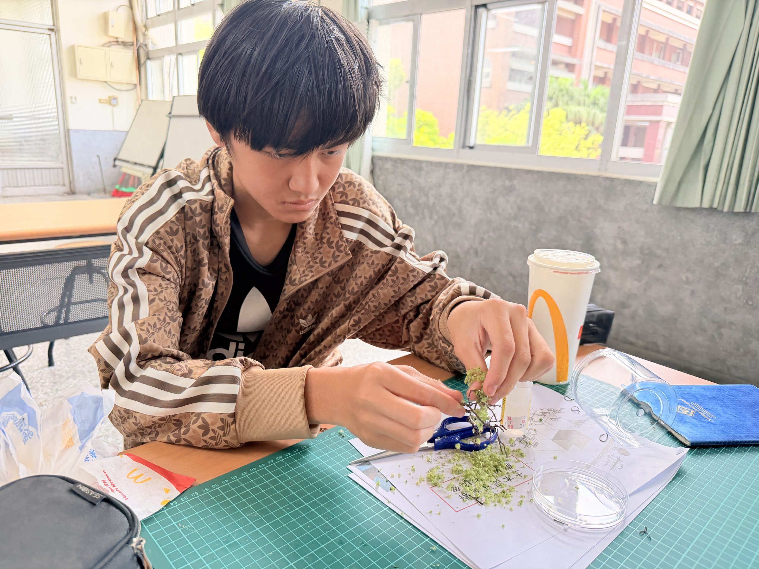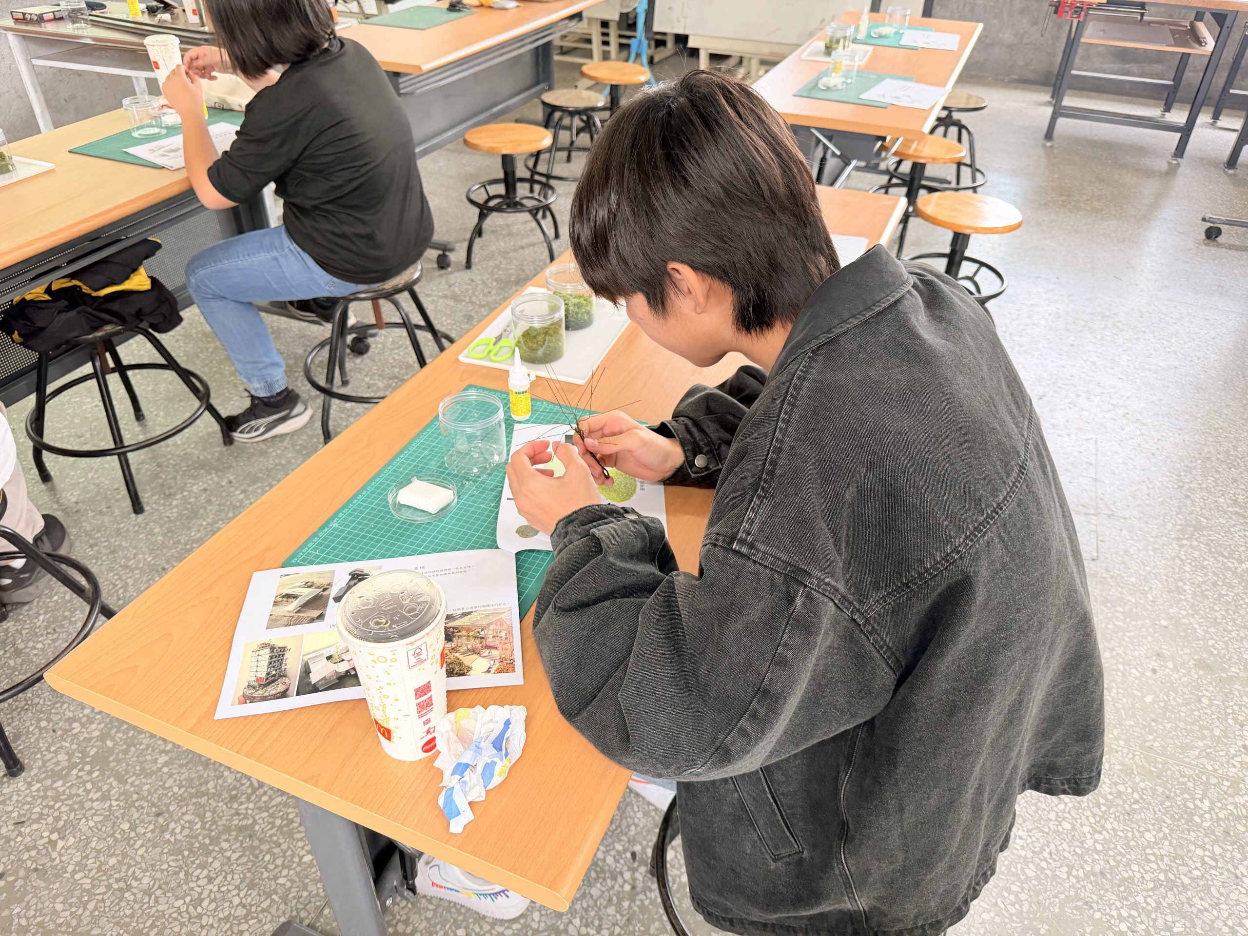 學生運用花藝鐵絲、草針粉與樹棉粉等素材,從無到有打造屬於自己的微型景觀。教室裡鋪滿各式材料,學生們低著頭,專心用花藝鐵絲一圈一圈纏繞、彎折,再撒上草針粉與樹棉粉,一點一滴把「一棵樹」慢慢長出來。有人做出枝幹挺拔的大樹,有人則是細緻柔軟的小樹,每一棵都不一樣,彷彿是學生內在想像的具體呈現,讓人印象深刻。