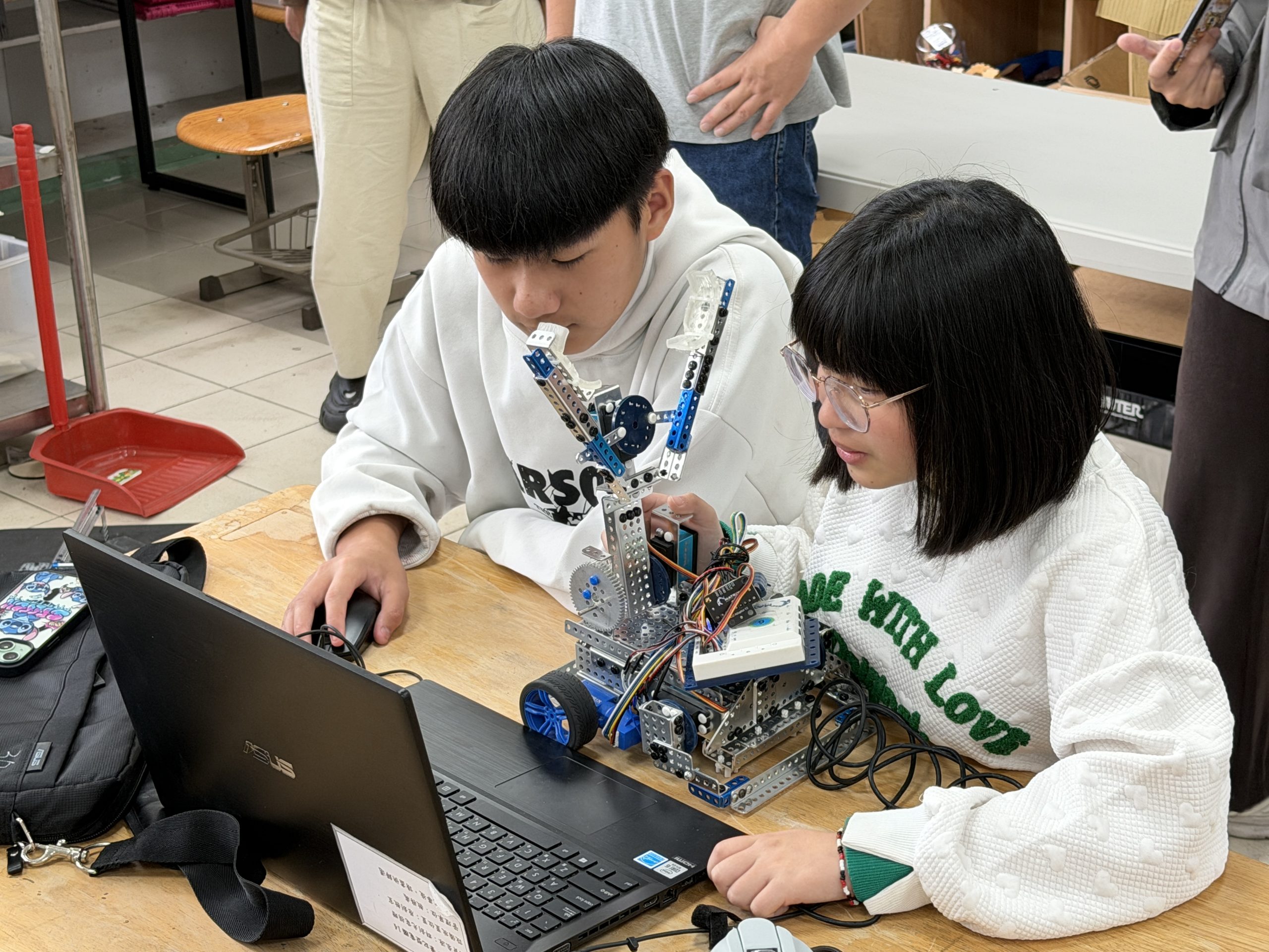 學生面對的是機器人與程式指令,一行行設定、一遍遍測試,讓機器人依照指令準確動作。有時候一個小小的錯誤,就得重新檢查、修正,但他們沒有急躁,而是耐心地反覆嘗試。當機器人順利完成動作的那一刻,臉上的笑容特別真實,也讓人感受到「成功是試出來的」那種踏實感。