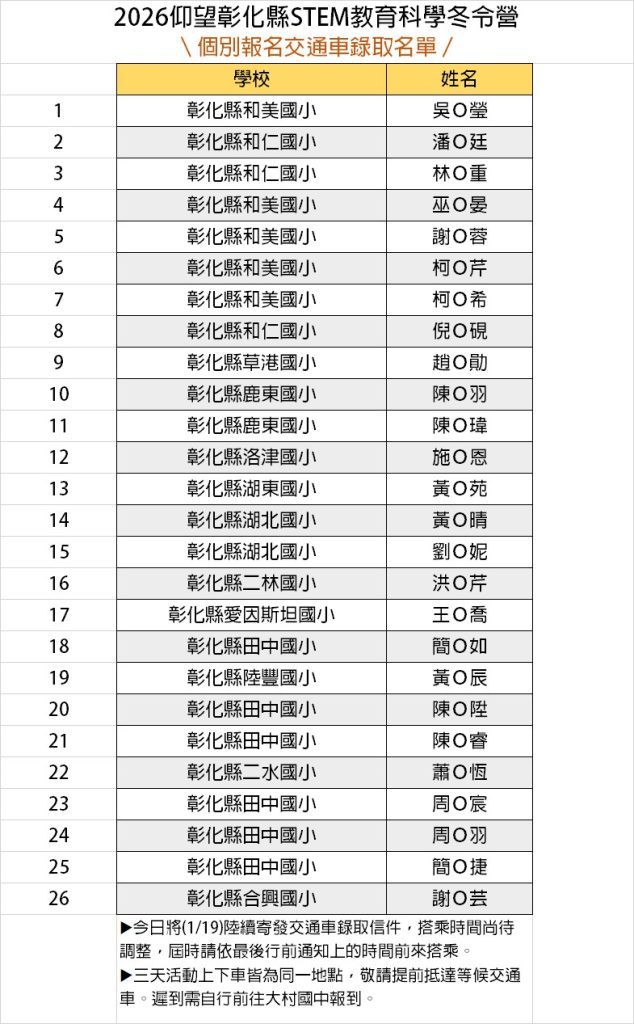 2026仰望STEM教育科學冬令營個別報名交通車錄取名單|彰化區
