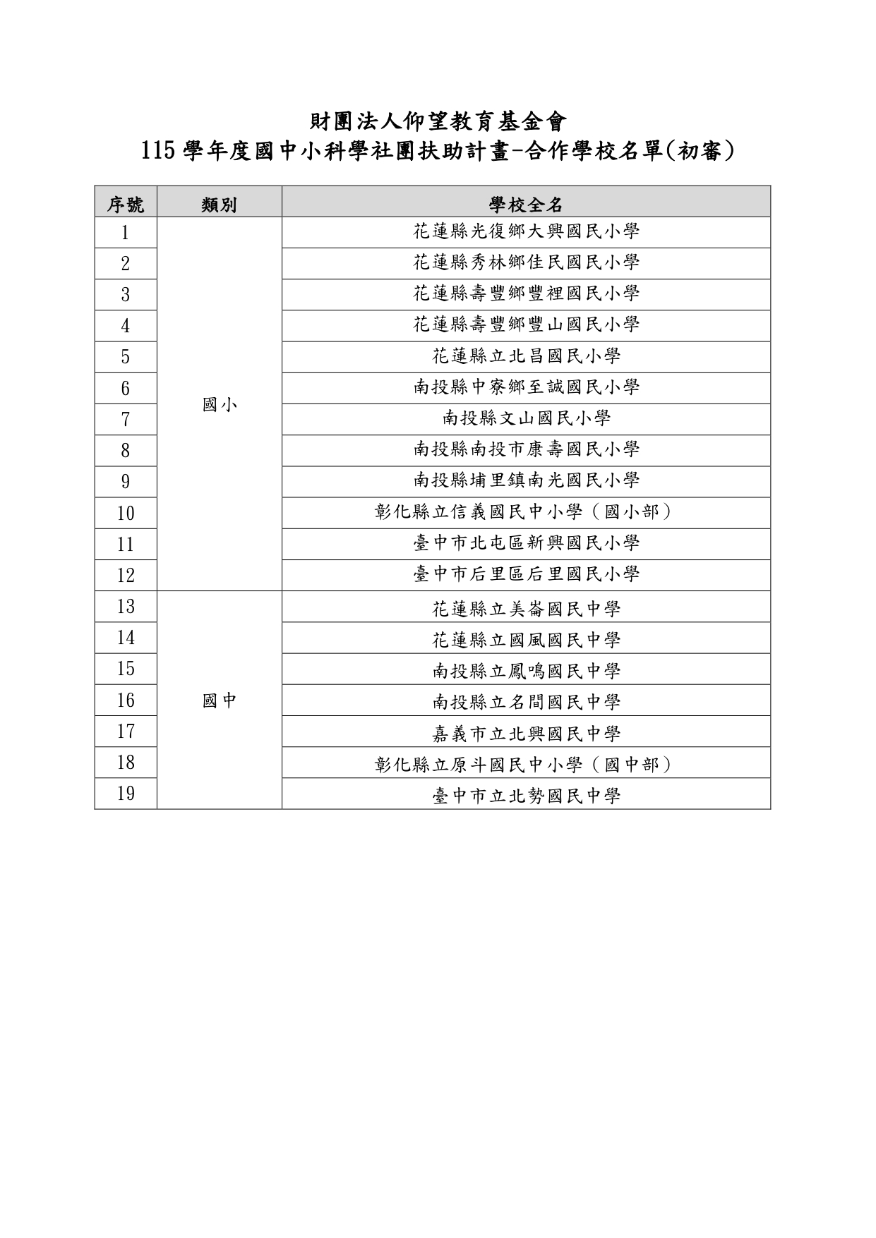 ▌115學年度「國中小科學社團扶助計畫」合作學校名單公告(初審)
