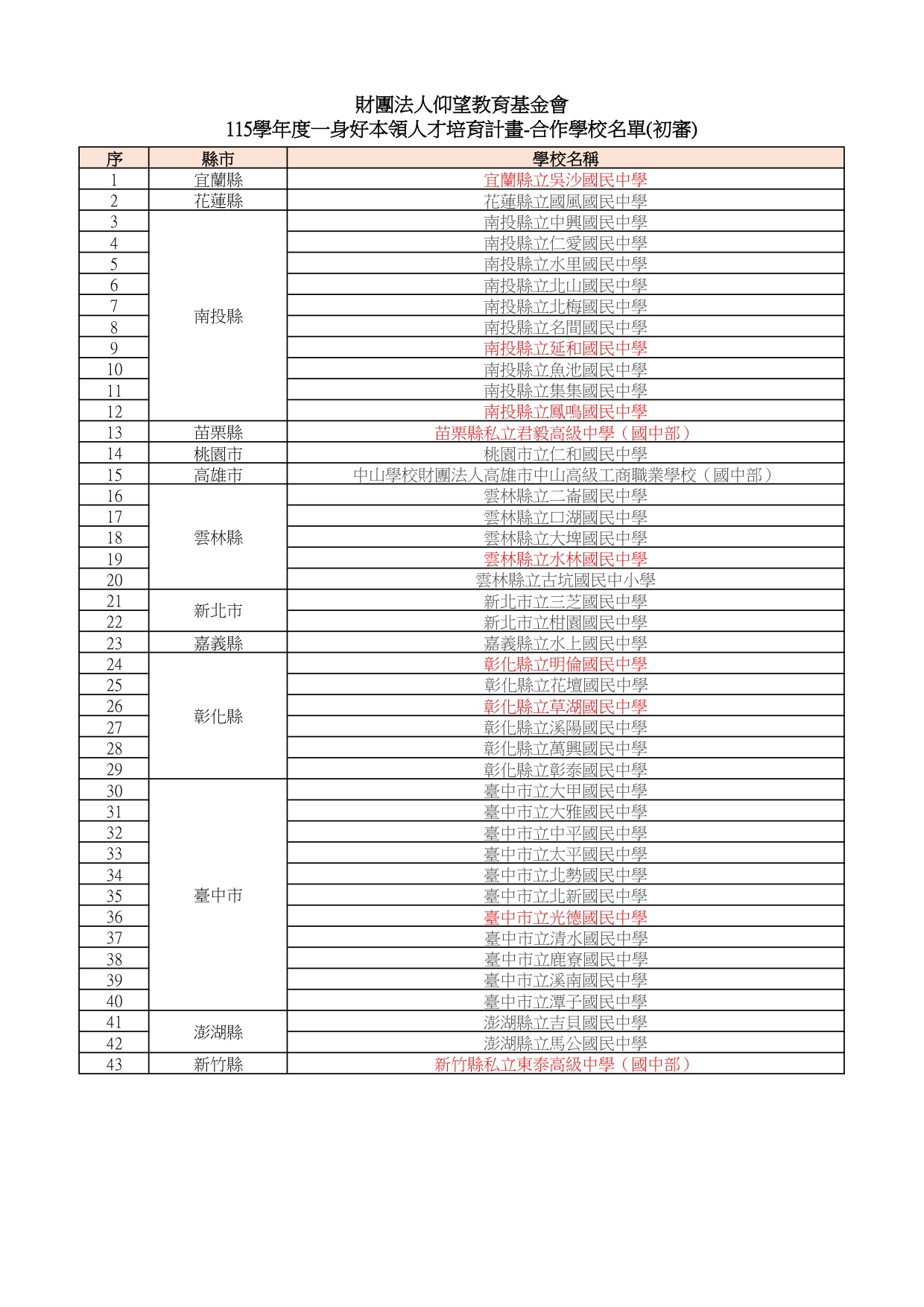 感謝各校踴躍申請,115學年度一身好本領人才培育計畫共有43間合作學校參與。